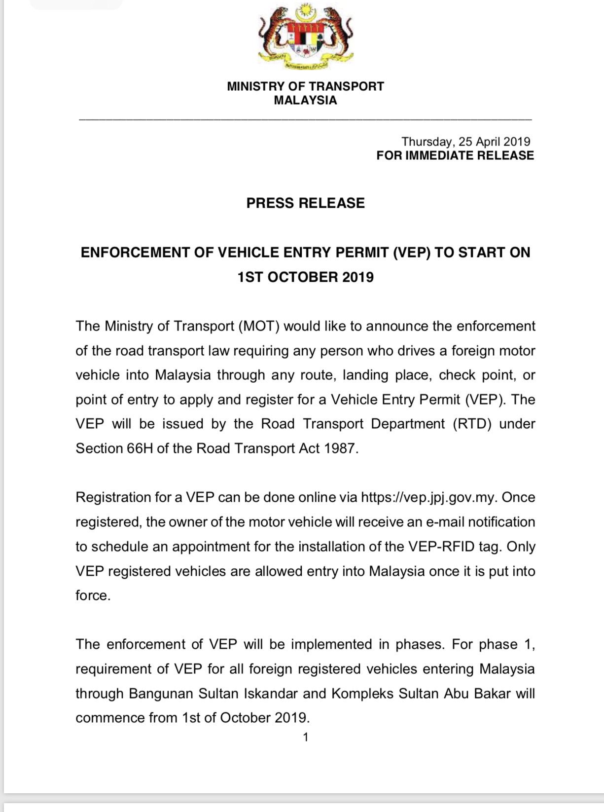 Melissa Goh On Twitter Starting Oct 1 Only Vep Registered Vehicles Are Allowed Entry Into Malaysia Registration For A Vep Can Be Done Online Via Https T Co Uyo5i5qpxi Once Registered The Owner Will Receive