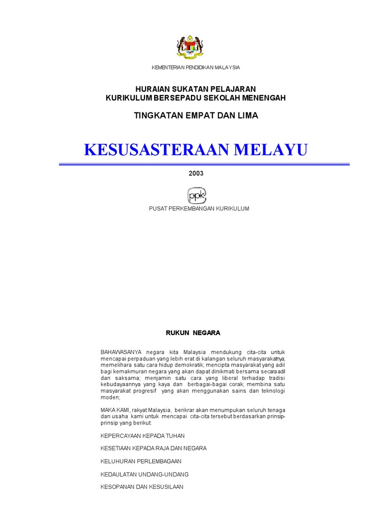 Huraian Sukatan Pelajaran Tingkatan Lima Bahasa Melayu Pendidikan Malaysia Kurikulum Bersepadu Sekolah Menengah Huraian Sukatan Pelajaran Tingkatan Lima Bahasa Melayu Pusat Perkembangan