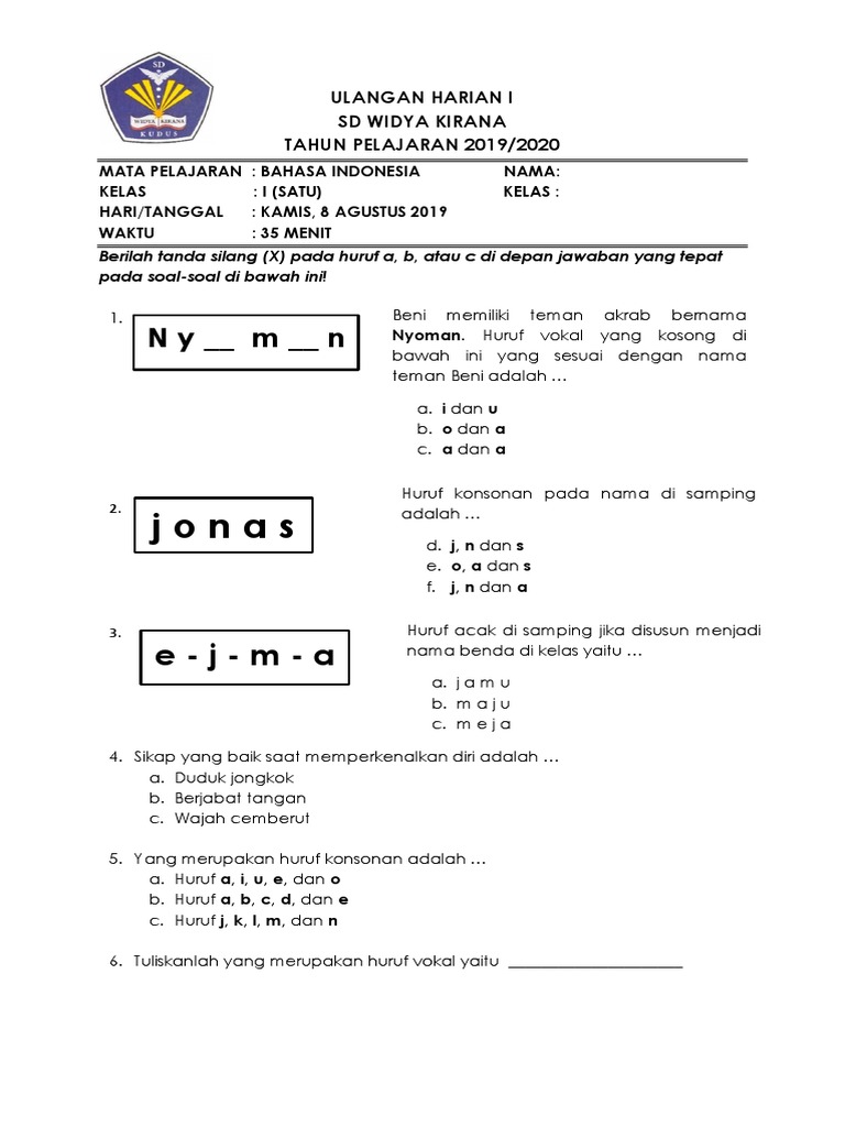 Soal Ulangan Harian Bahasa Indonesia Sd Kelas 1