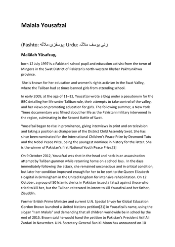 Reading Comprehension Malala Yousafzi English Esl Worksheets For Distance Learning And Physical Classrooms