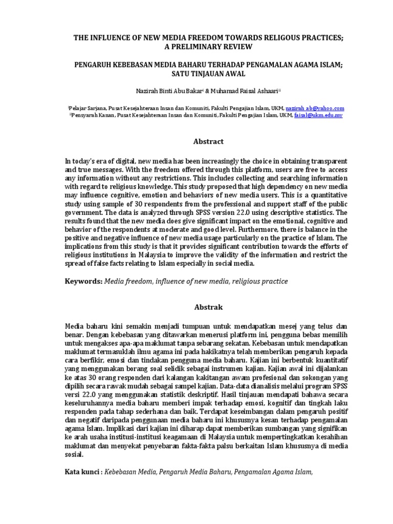 Pengaruh Kebebasan Media Baharu Terhadap Pengamalan Agama Islam Satu Tinjauan Awal