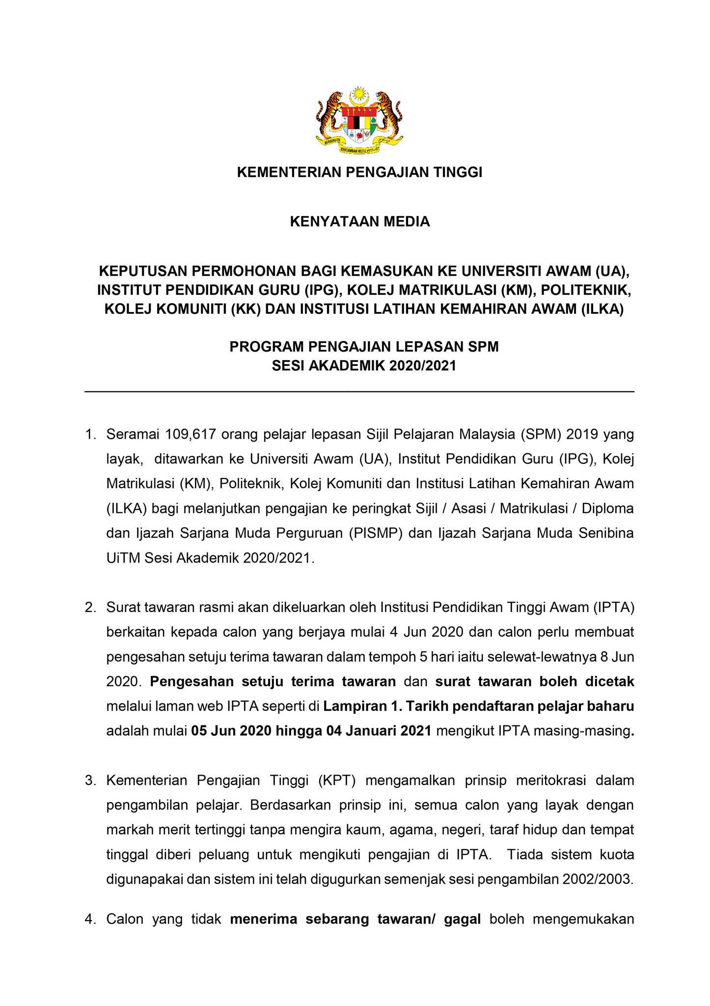 Kementerian Pengajian Tinggi Sur Twitter Kenyataan Media Keputusan Permohonan Upuonline Bagi Kemasukan Ke Universiti Awam Ua Institut Pendidikan Guru Ipg Kolej Matrikulasi Km Politeknik Kolej Komuniti Kk Dan Institusi Latihan Kemahiran