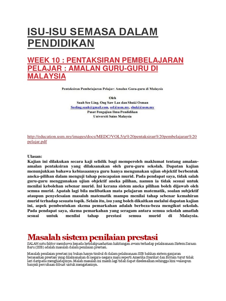 Isu Isu Semasa Dalam Pendidikan Week 10 Pentaksiran Pembelajaran Pelajar Amalan Guru Guru Di Malaysia