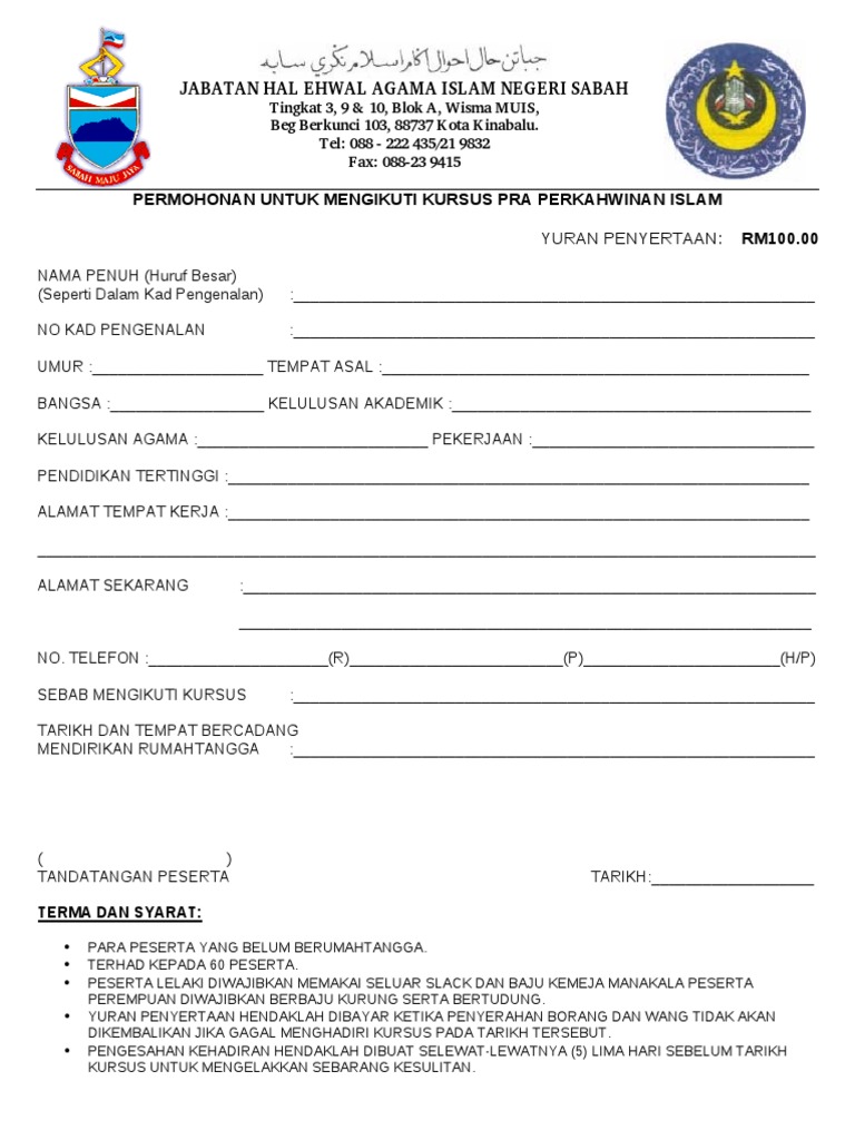 Jabatan Hal Ehwal Agama Islam Negeri Sabah Untuk Mengikuti Kursus Pra Perkahwinan Islam Yuran Penyertaan Rm100 00 Nama Penuh Huruf Besar Seperti Dalam Kad Pengenalan