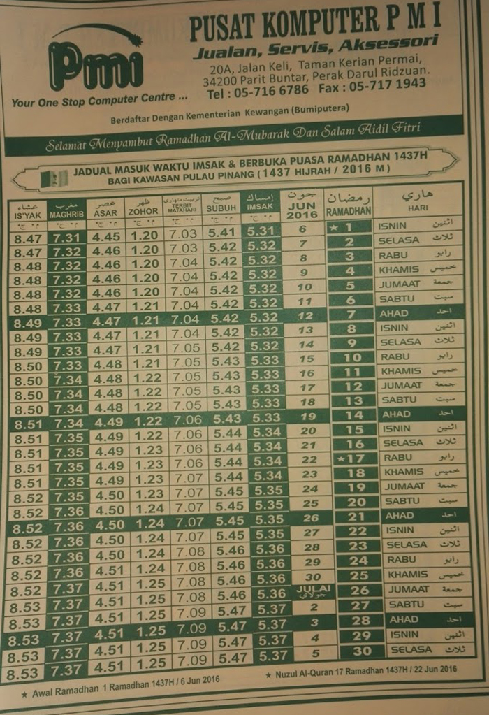 Jadual Waktu Berbuka Puasa Dan Imsak 1437 H 2016 M Bagi Negeri Pulau Pinang Kau Ilhamku