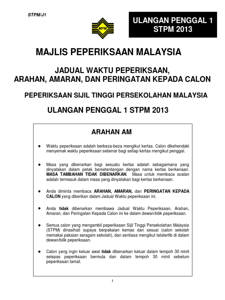 Jadual Peperiksaan Ulangan Penggal 1 Stpm 2013