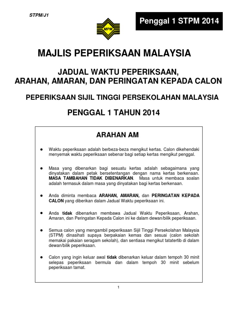 Jadual Peperiksaan Penggal 1 Stpm 2014