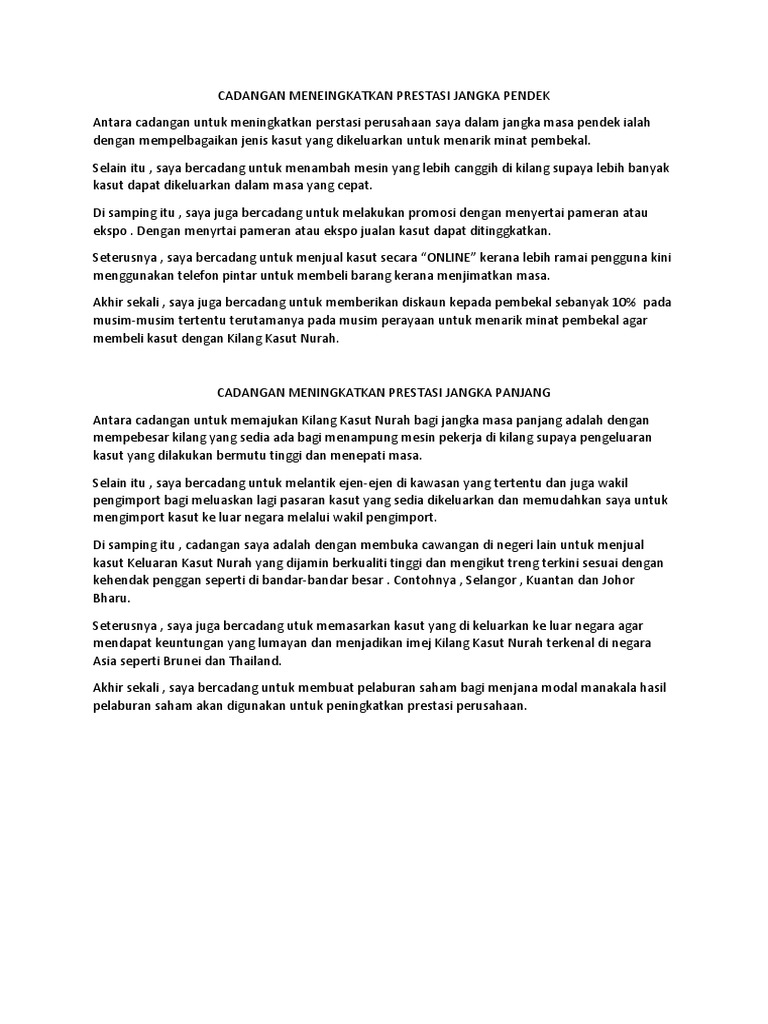 Mengemukakan Cadangan Untuk Meningkatkan Prestasi Semasa Dan Jangka Panjang Perniagaan Folio Spm 2011