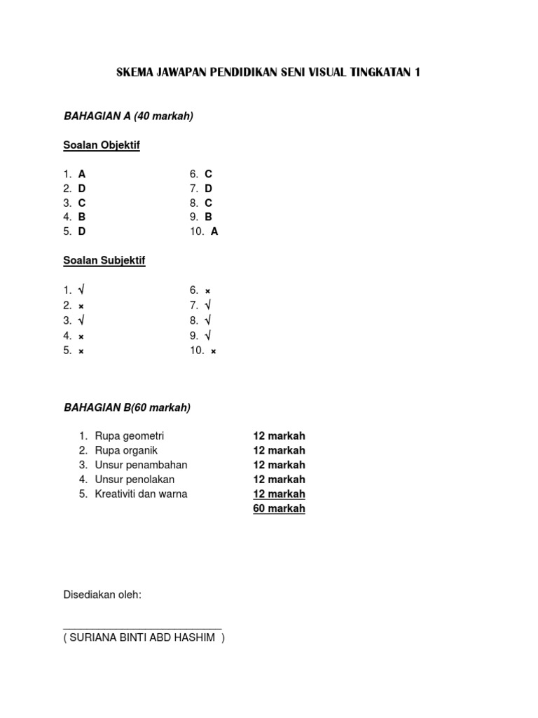 Skema Jawapan Pendidikan Seni Visual Tingkatan 1