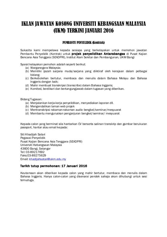 Iklan Jawatan Kosong Universiti Kebangsaan Malaysia Ukm Januari 2016