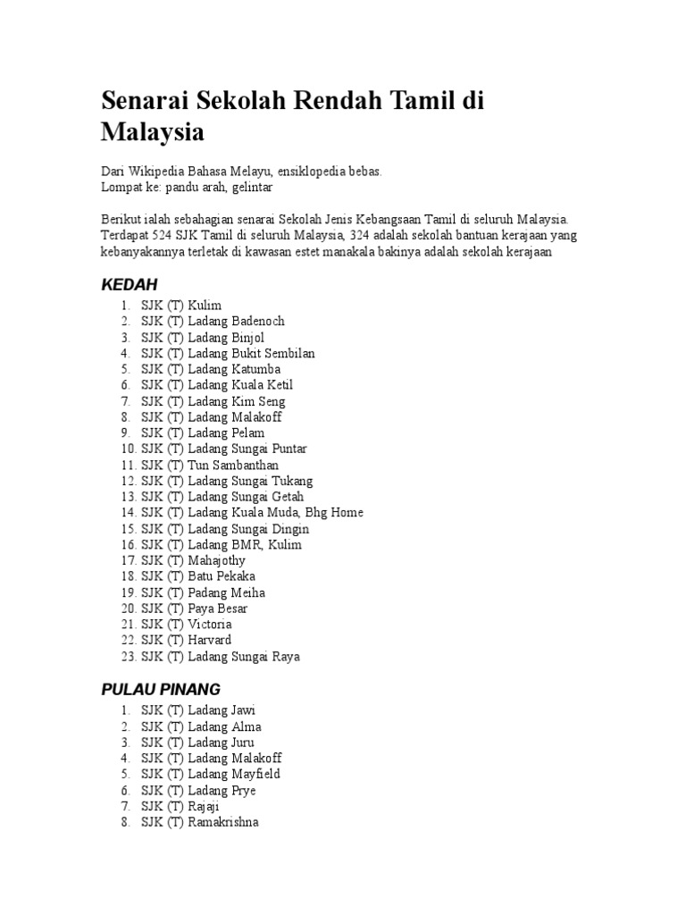 Senarai Sekolah Rendah Tamil Di Malaysia