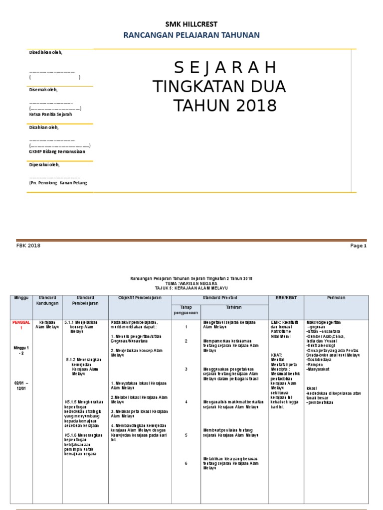 Rancangan Pelajaran Tahunan Sejarah Tingkatan 2 Tahun 2018