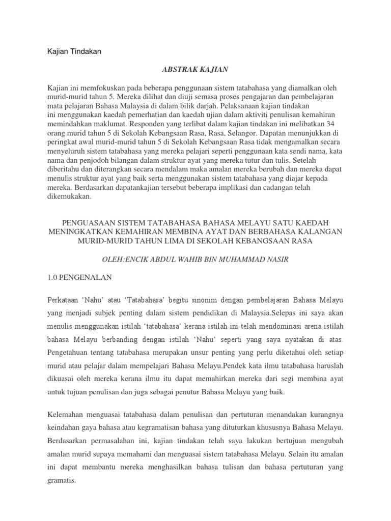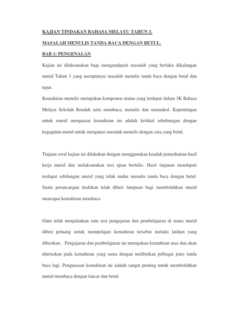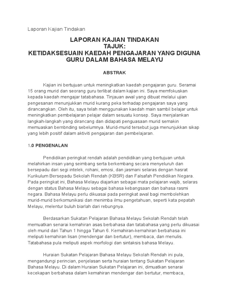 Kajian tindakan bahasa melayu tahun 1. Contoh kajian tindakan bahasa melayu. 1institut pendidikan guru kampus tun abdul razak jalan datuk mohd musa 94300 kota samarahan sarawak. Murid murid yang terlibat dalam kajian ini terdiri daripada 15 orang murid lelaki melayu dan 15 orang murid perempuan melayu dalam tahun 4. Kajian ini akandilaksanakan mengikut proses dan prosedur kajian tindakan seperti berikut langkah 1 pengenalpastian isu dan masalahpada peringkat permulaan saya dapati pelajar kurang memberikan respon semasapengajaran dan pembelajaran berlangsung.