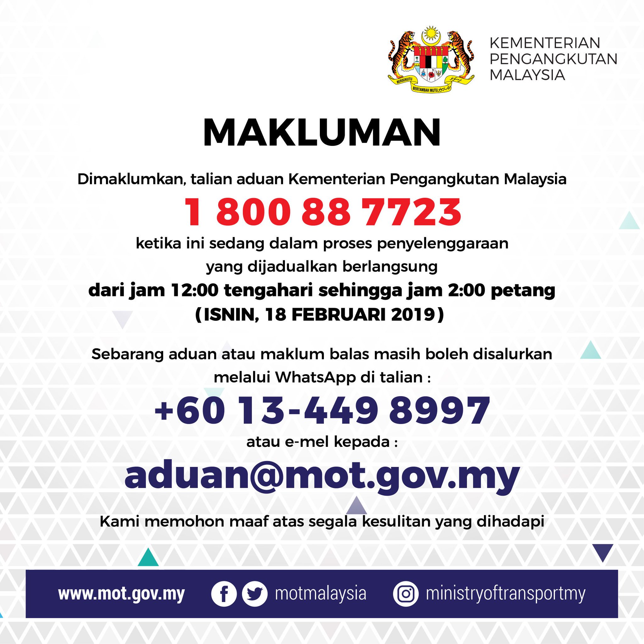 M O T Malaysia On Twitter Notis Makluman Kerja Kerja Penyelenggaraan Talian Aduan Mot Bertarikh 18 Februari 2019 Aduan Atau Pertanyaan Masih Boleh Disalurkan Ke Talian Whatsapp Atau Ke Alamat E Mel Yang Tertera Kami Memohon