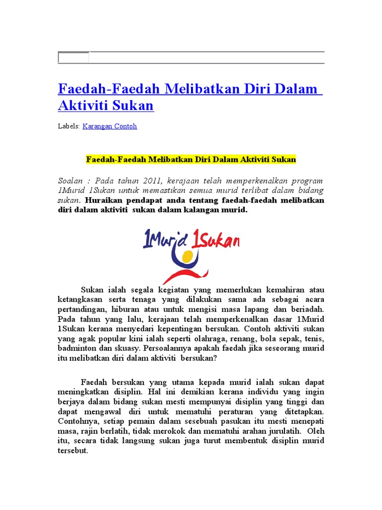 Karangan stpm manfaat dasar 1 murid 1 sukan dasar 1 murid 1sukan 1m 1s mewajibkan setiap murid menyertai sekurang kurangnya satu aktiviti sukan di sekolah. Contoh karangan fokus. Dasar ini menyokong pelaksanaan falsafah pendidikan kebangsaan yang berhasrat untuk melahirkan insan yang seimbang dari segi intelek rohani emosi dan jasmani. Sudah sampai masanya kita melihat sukan sebagai satu komponen utama dalam usaha memajukan sistem pendidikan negara itu.