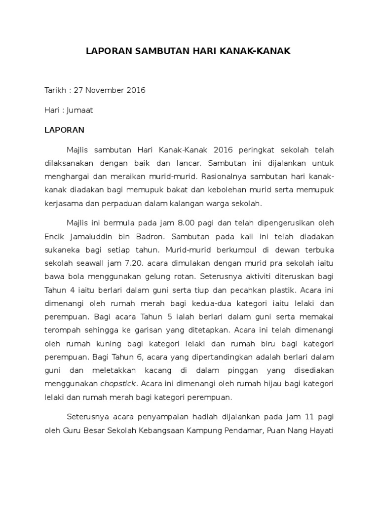 Sebagai setiausaha persatuan bahasa melayu kamu diminta menulis laporan tentang sambutan tersebut. Hasif zakwan bin mohd hamidi ialah murid tahun 6 sekolah kebangsaan kebangsaan seri tualang temerloh 2011. Pada hari kanak kanak saya tiba di sekolah lebih awal dari biasa. Tujuan sambutan ini diadakan adalah untuk meraikan kanak kanak yang bakal menjadi pemimpin pada suatu hari nanti.