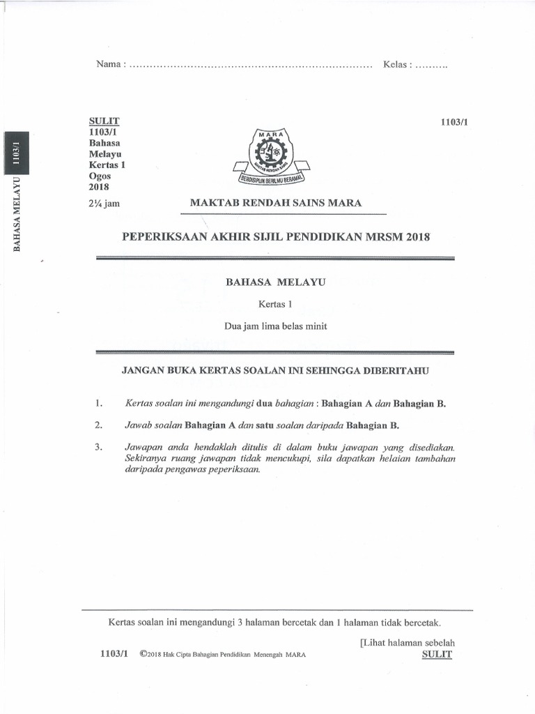 Percubaan Spm Bahasa Melayu Mrsm 2018 Sumber Pendidikan