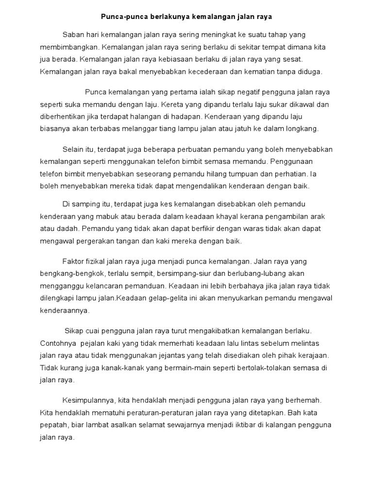 Karangan Ppsr Punca Punca Kemalangan Di Jalan Raya Duniaku Nasa2k