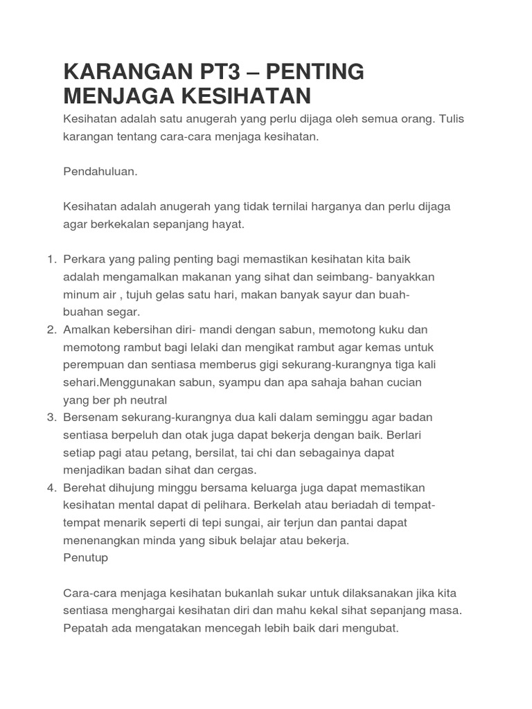 Bahasa Melayu Pt3 Contoh Karangan Gaya Hidup Sihat Pt3