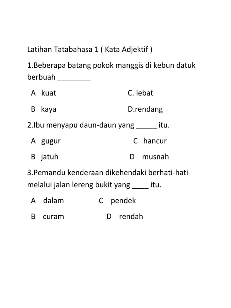 Kata Adjektif Pdf Latih Tubi Tatabahasa Kata Adjektif Kata Adjektif Kata Adjektif Ialah Perkataan Yang Menerangkan Sifat Sesuatu Benda Keadaan Atau Course Hero