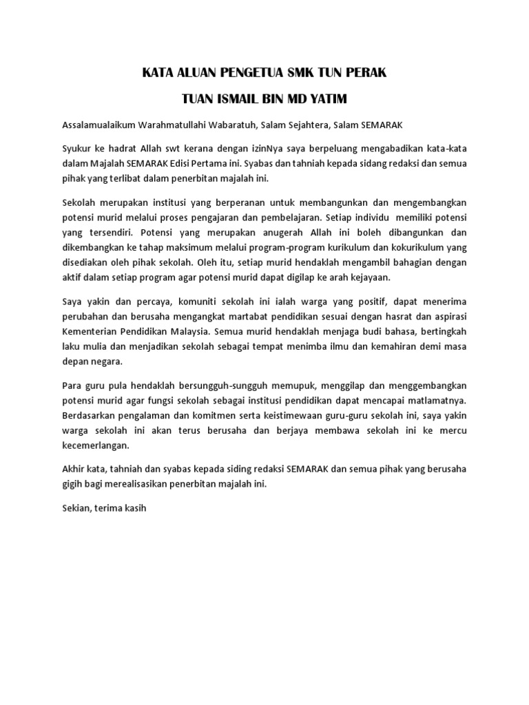 Kata Aluan Pengetua Smk Tun Perak