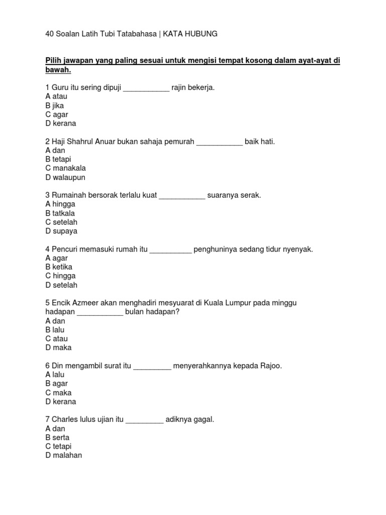 40 Soalan Latih Tubi Tatabahasa Kata Hubung Pmr