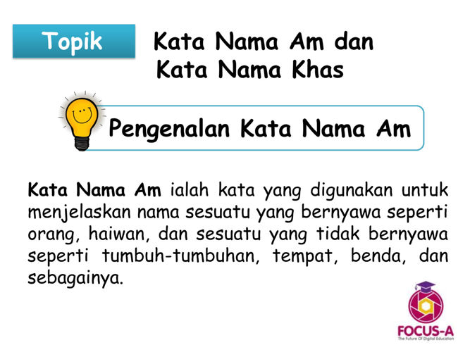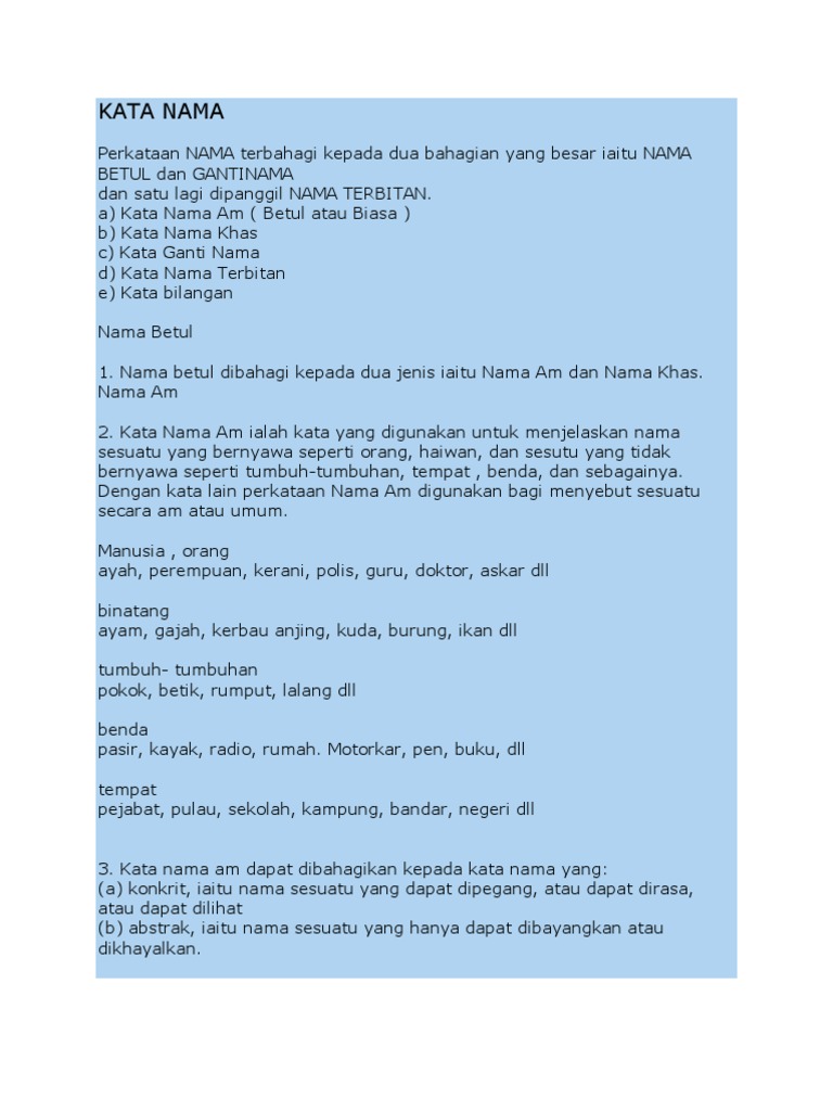 Huruf pertama kata nama khas mestilah ditulis dengan huruf besar. Kata nama am ialah kata yang digunakan untuk menjelaskan nama sesuatu yang bernyawa seperti orang haiwan dan sesuatu yang tidak bernyawa seperti tumbuh tumbuhan tempat benda dan sebagainya. Contoh kata nama khas adalah seperti yang berikut a manusia doktor ali puan zainab cikgu puspa awie encik lim. Kata nama ialah kata yang menunjukkan benda orang haiwan perkara dan tempat.