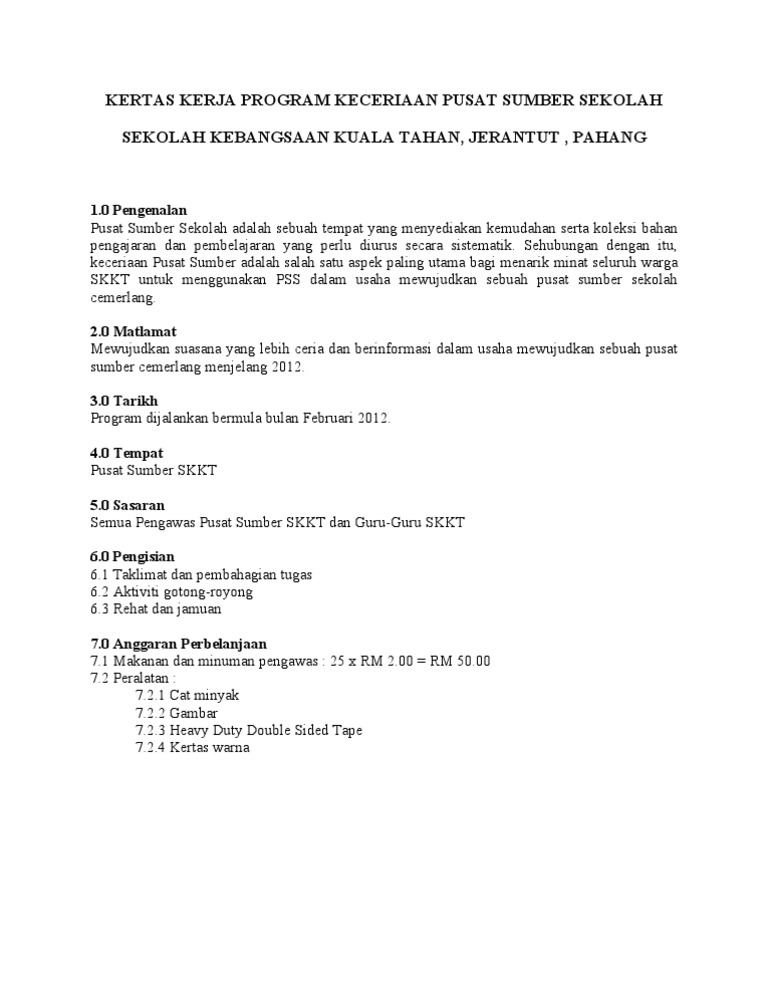 Kertas Kerja Program Keceriaan Pusat Sumber Sekolah Sekolah Kebangsaan Kuala Tahan Jerantut Pahang